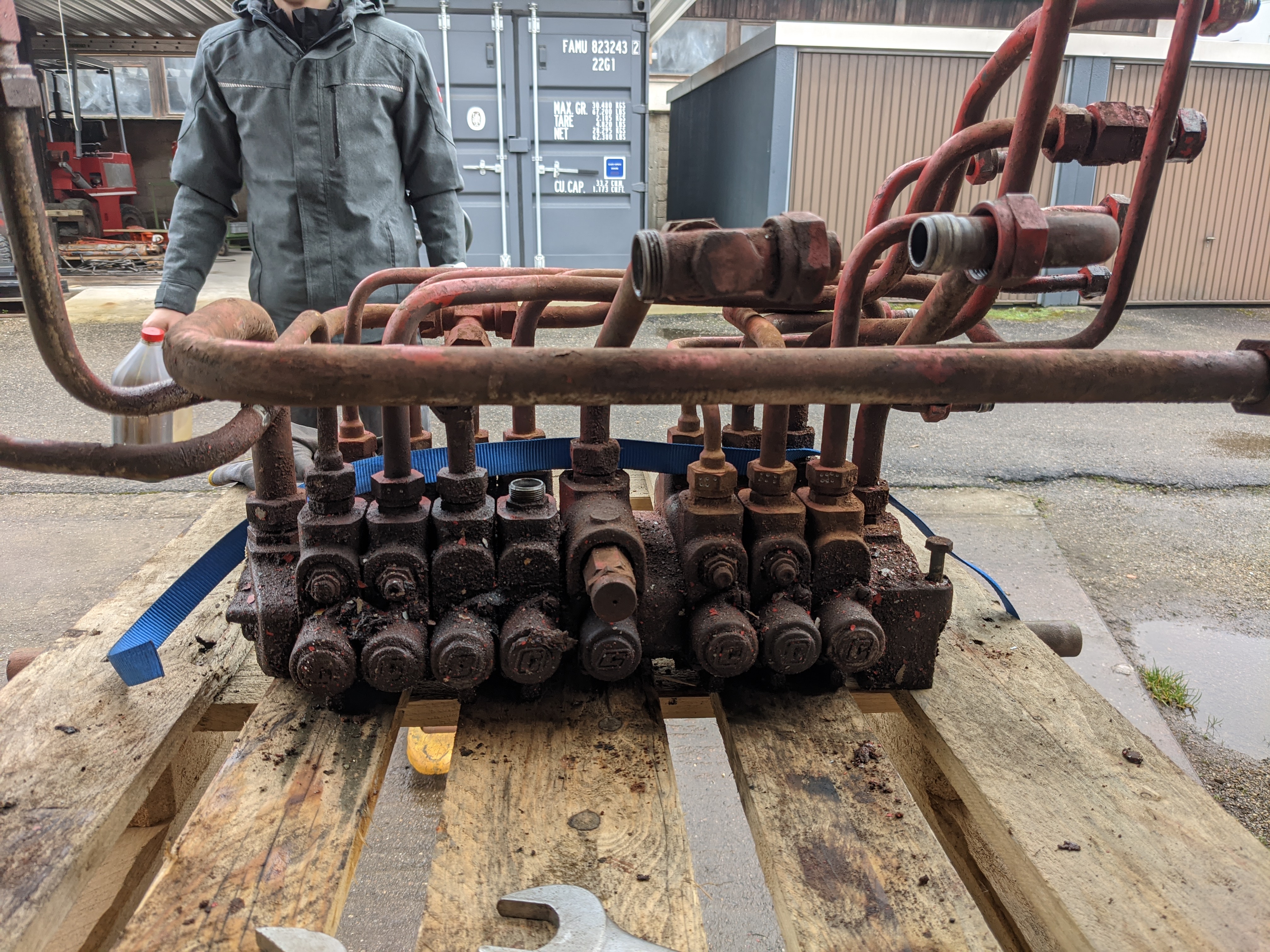 Glücklicher Weise war beim Bagger noch ein halber ziemlich verrotteter Steuerblock dabei. Lag in der Baggerschaufel.