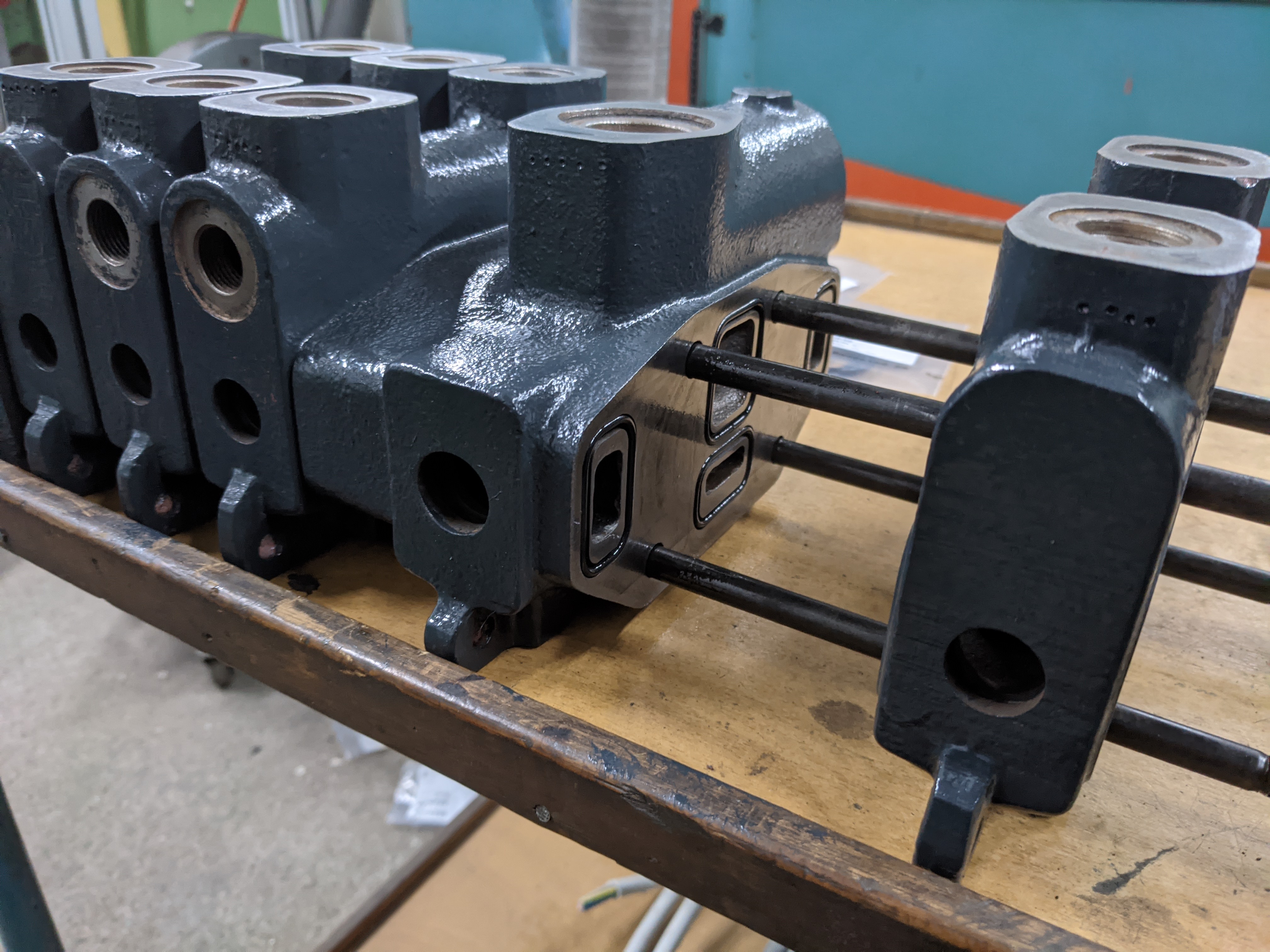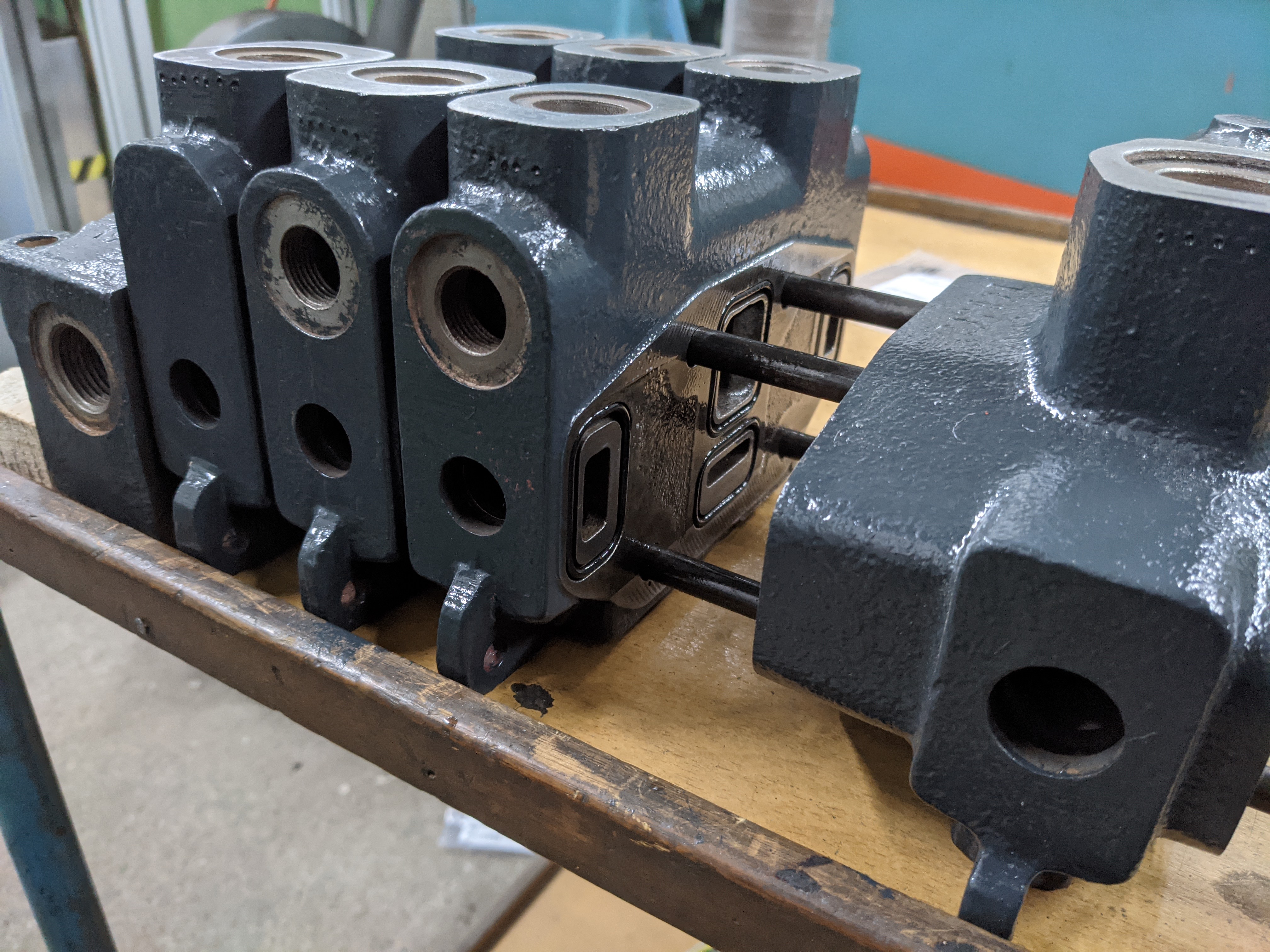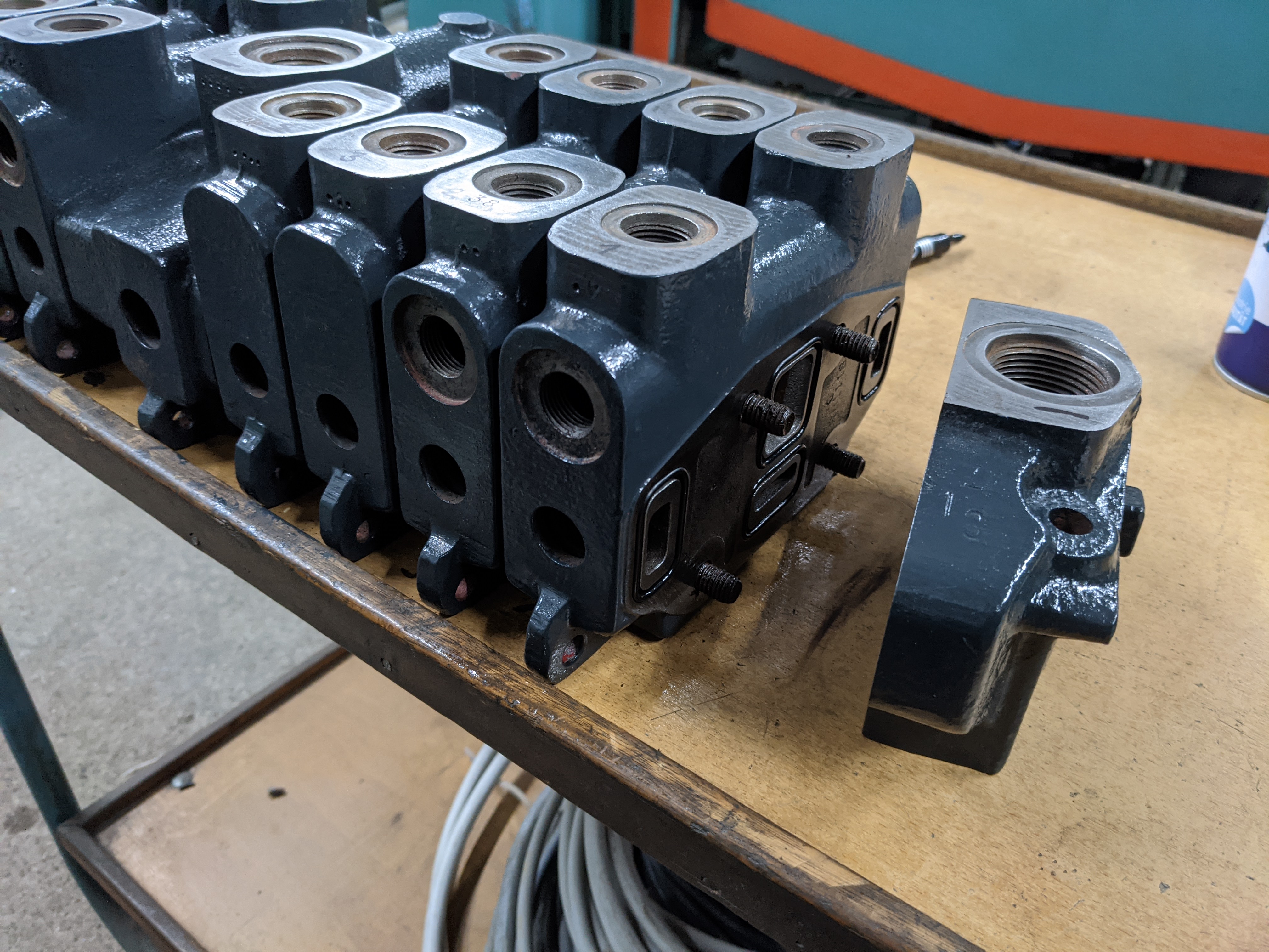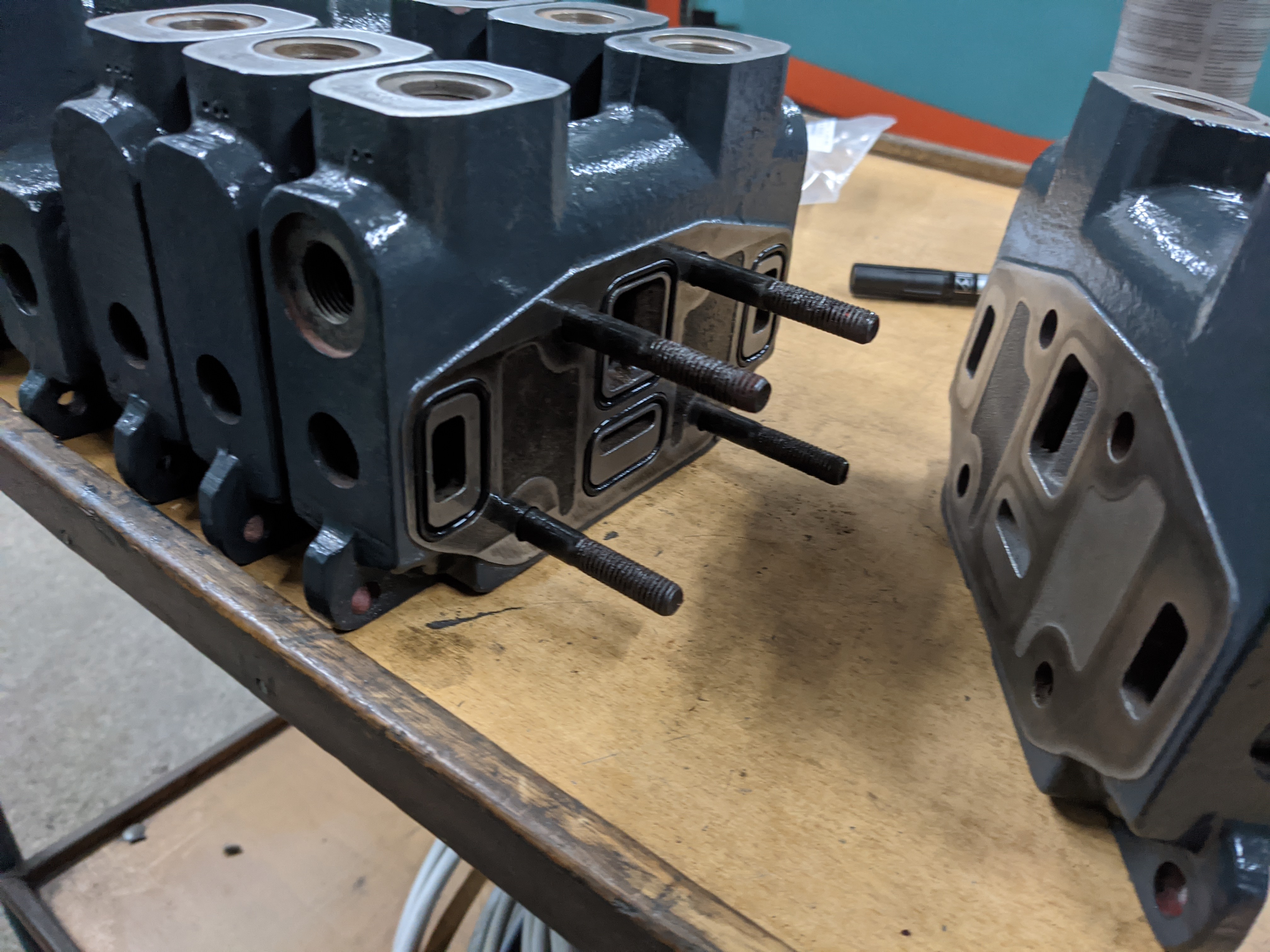 Scheibchen für Scheibchen wird wieder ein Steuerblock aus den Gussteilen. Hat erstaunlich gut geklappt die O-Ringe in eckige Nuten zu drücken und dann alles auf einmal mit ewig langen Schrauben zu verspannen.
