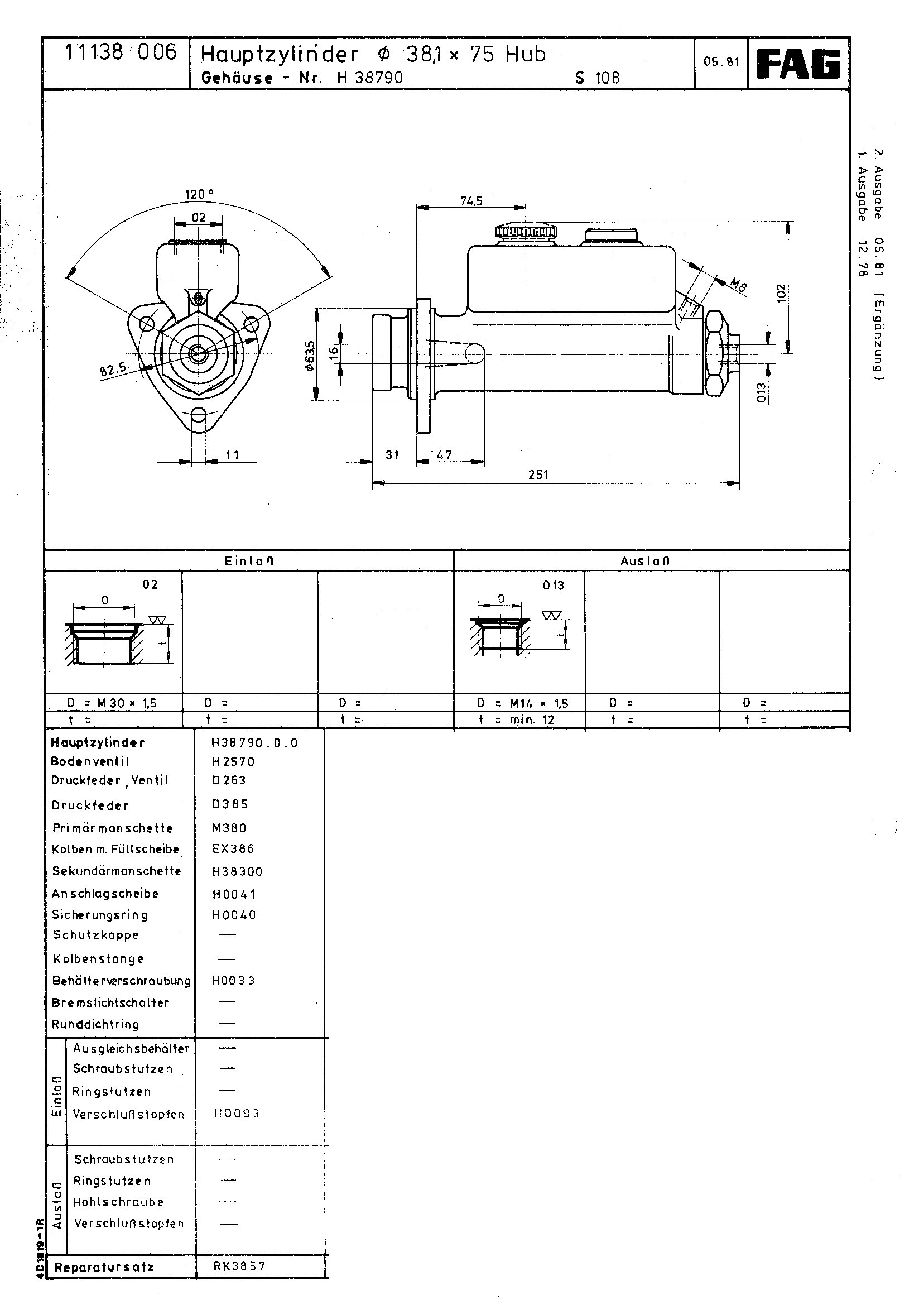Hauptzylinder FAG H 38790 , H 3890 38,1 x 75 mm Hub