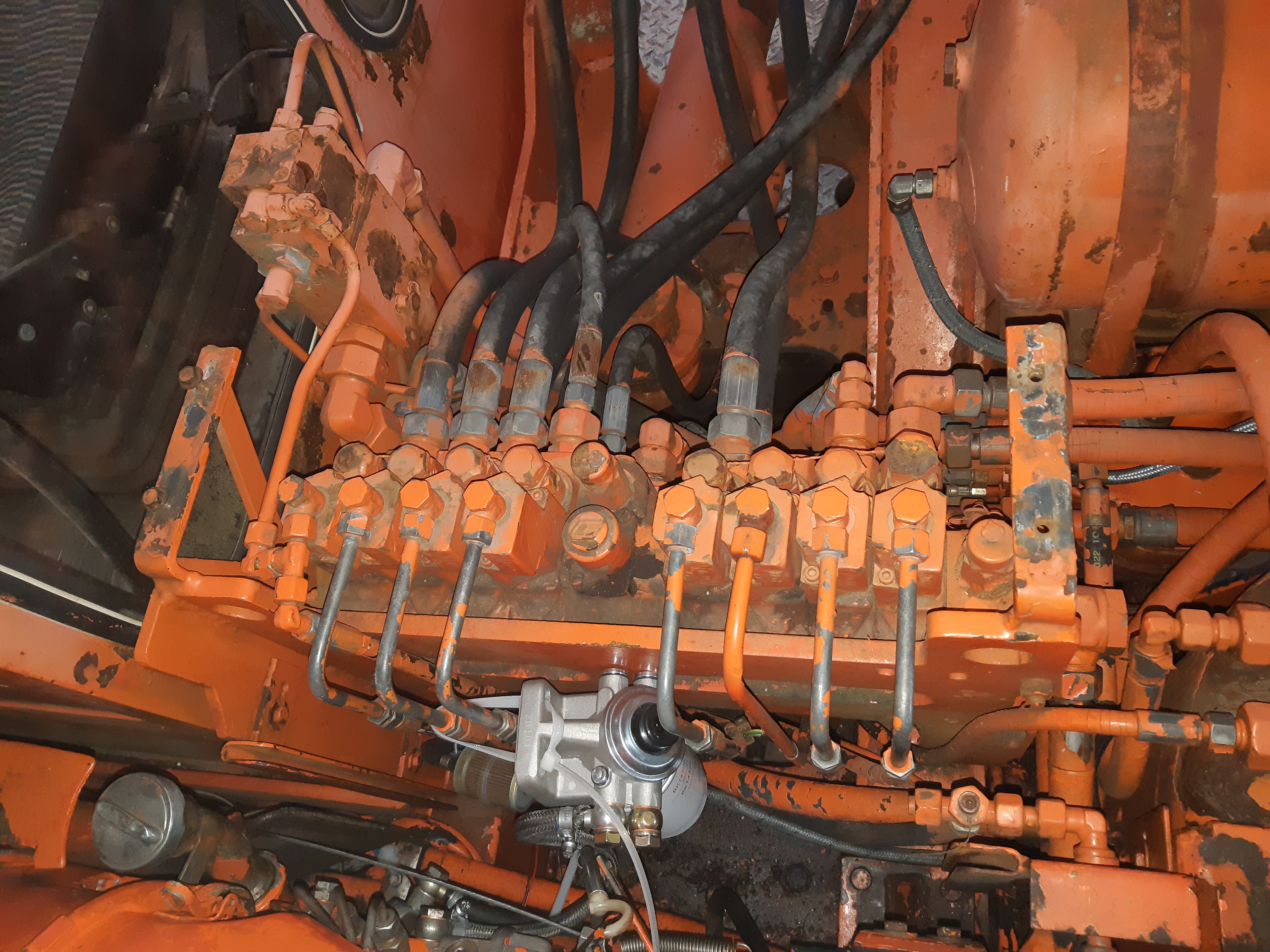 Also bei meinem sitzt das Ventil nicht mit am Block, sondern abseits auf der rechten Seite zwischen Hydrauliktank und Schwenkgetriebe.