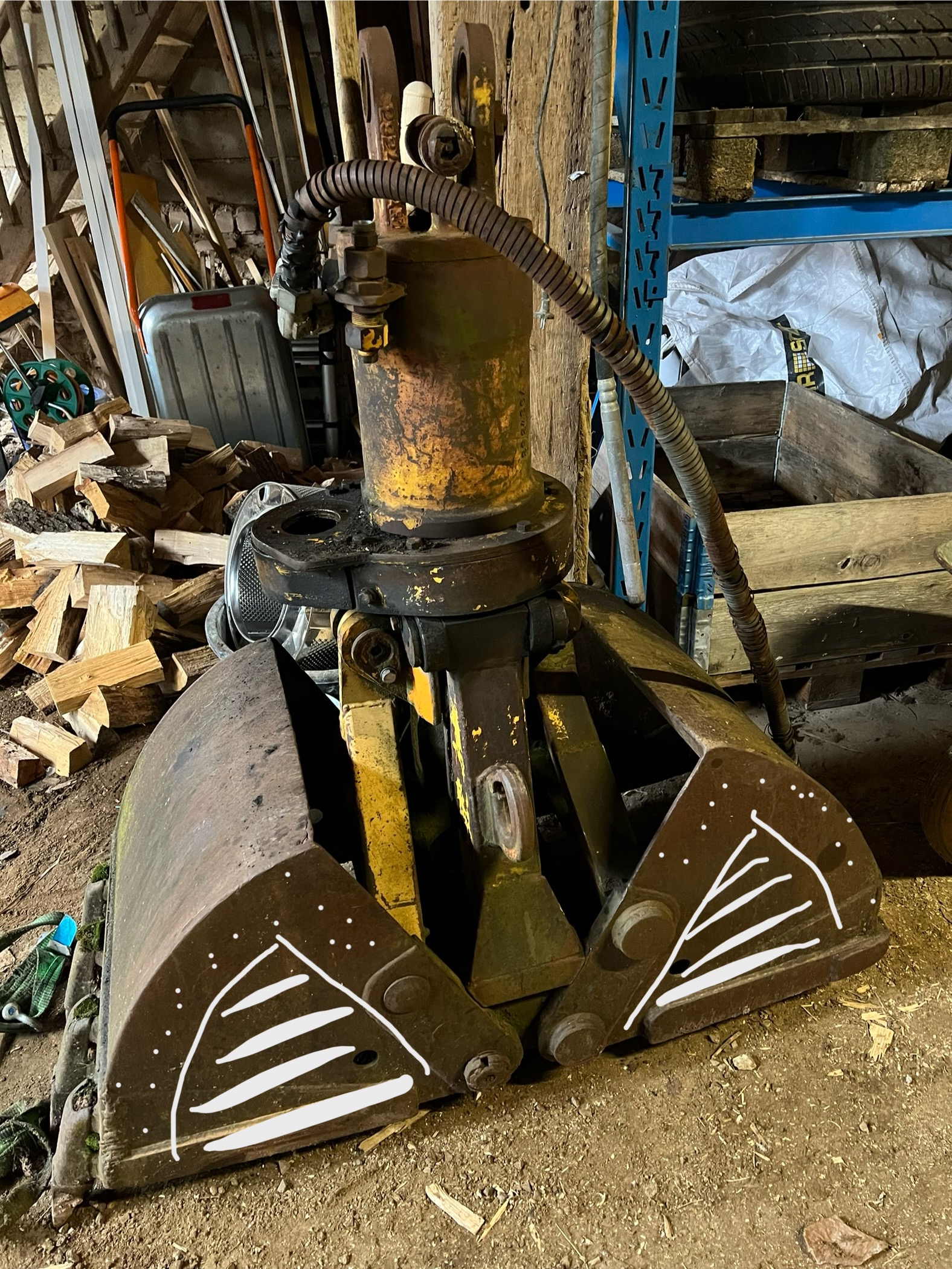 Da sich die Suche nach einem passenden Holzgreifer für meinen Bagger als schwierig gestaltet und ich außerdem langsam kein Geld mehr investieren möchte, suche ich nach einer Lösung, meinen vorhandenen Zweischalengreifer für die Waldarbeit umzubauen. Dieser hat von mir bereits neue Schläuche und einen intakten Ölmotor bekommen.