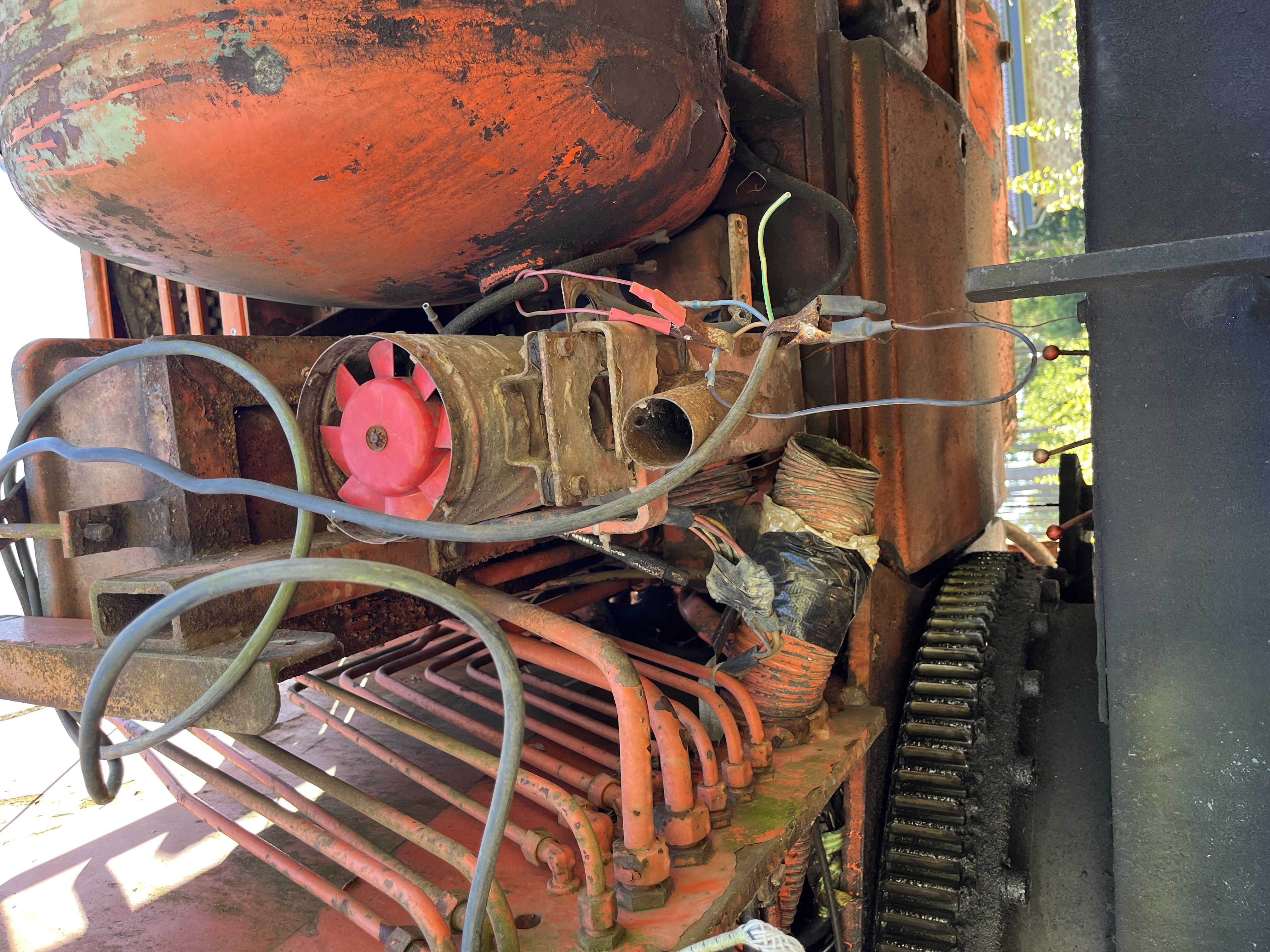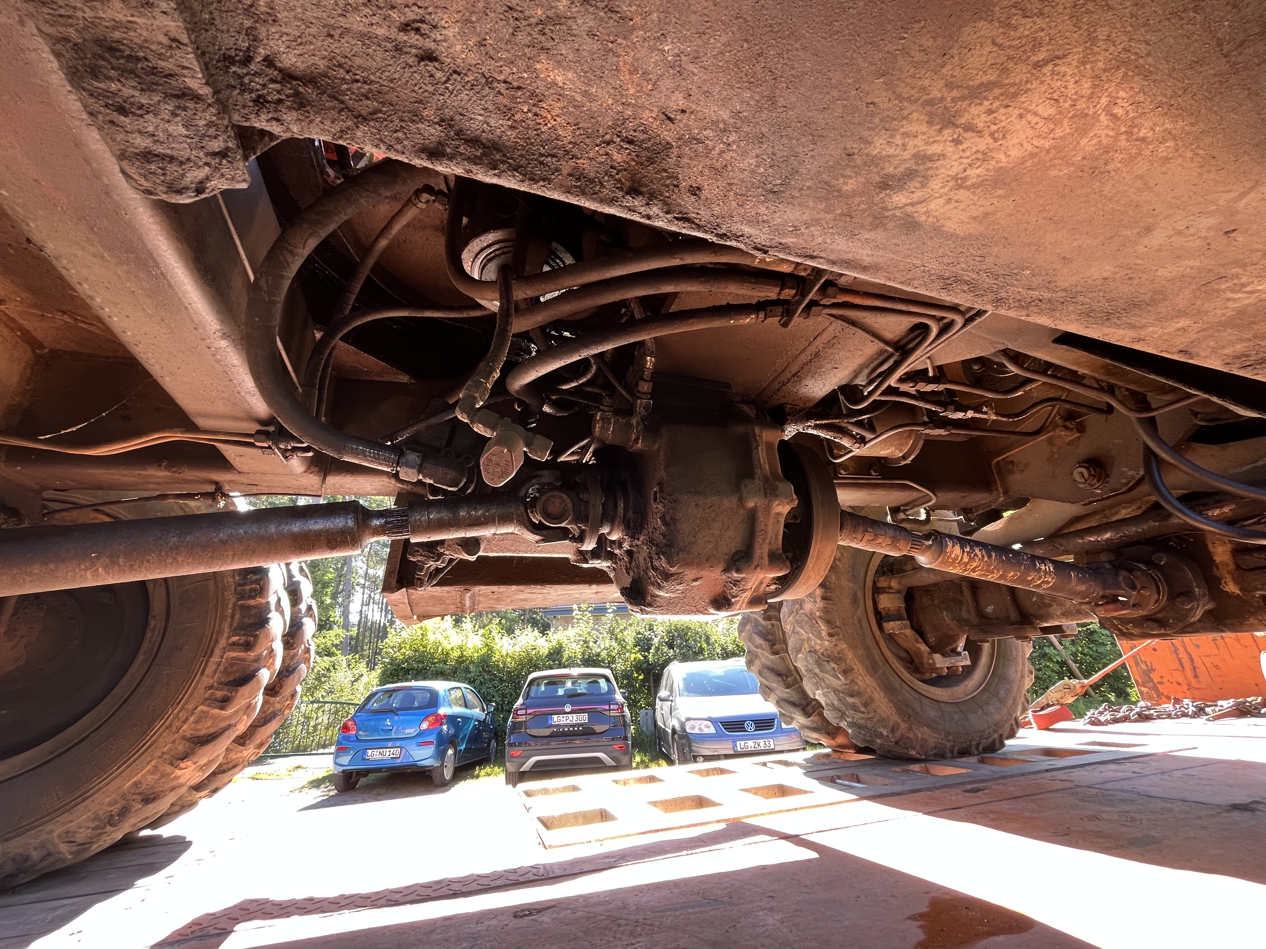 Was nicht funktioniert: Krabbelgang, Festellbremse, Betriebsbremse, wenig Antriebsmoment im Strassengang (kam die lange Auffahrrampe des Tiefladers nicht hoch), leichte Undichtigkeit am rechten Steuerhebel, leichte Undichtigkeiten, Spur stimmt mit blossem Auge nicht, ein Reifen platt, die beiden vorderen Fenster haben Risse, alle Beleuchtung /Blinker ist defekt, viel Spiel in den Buchsen der Umlenkungshebel, Die Kabine ist innen in einem bedauernswerten Zustand, Luft-Abschaltdruck liegt bei 6,8Bar, Moter orgelt ein wenig bis er anspringt (das er ein bißchen Qualmt ist normal ?).