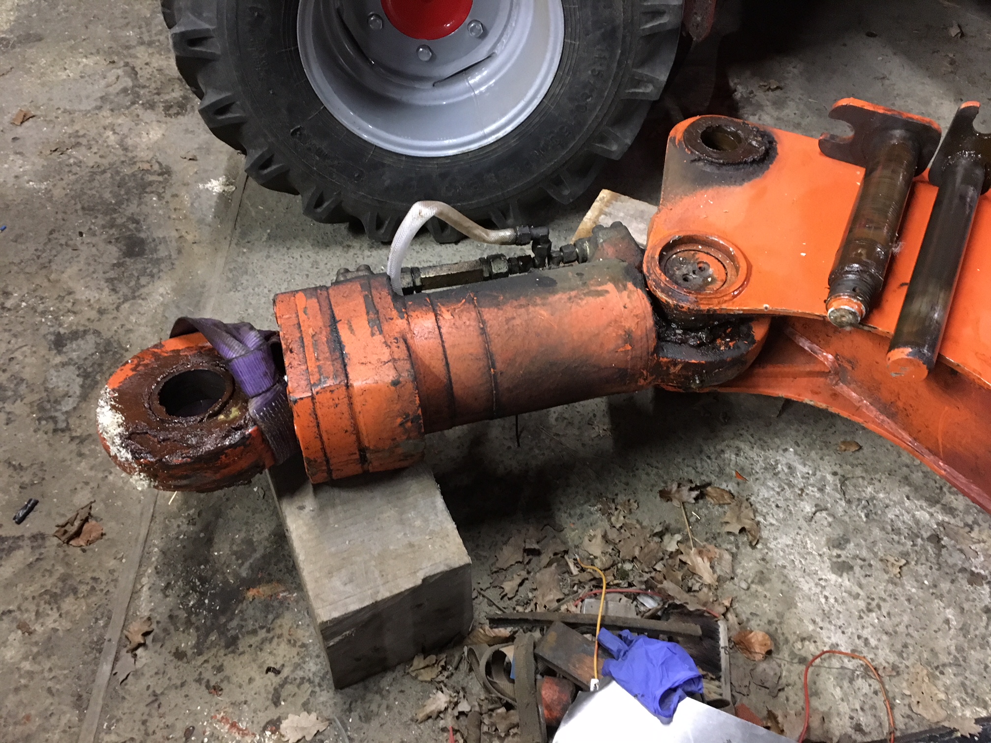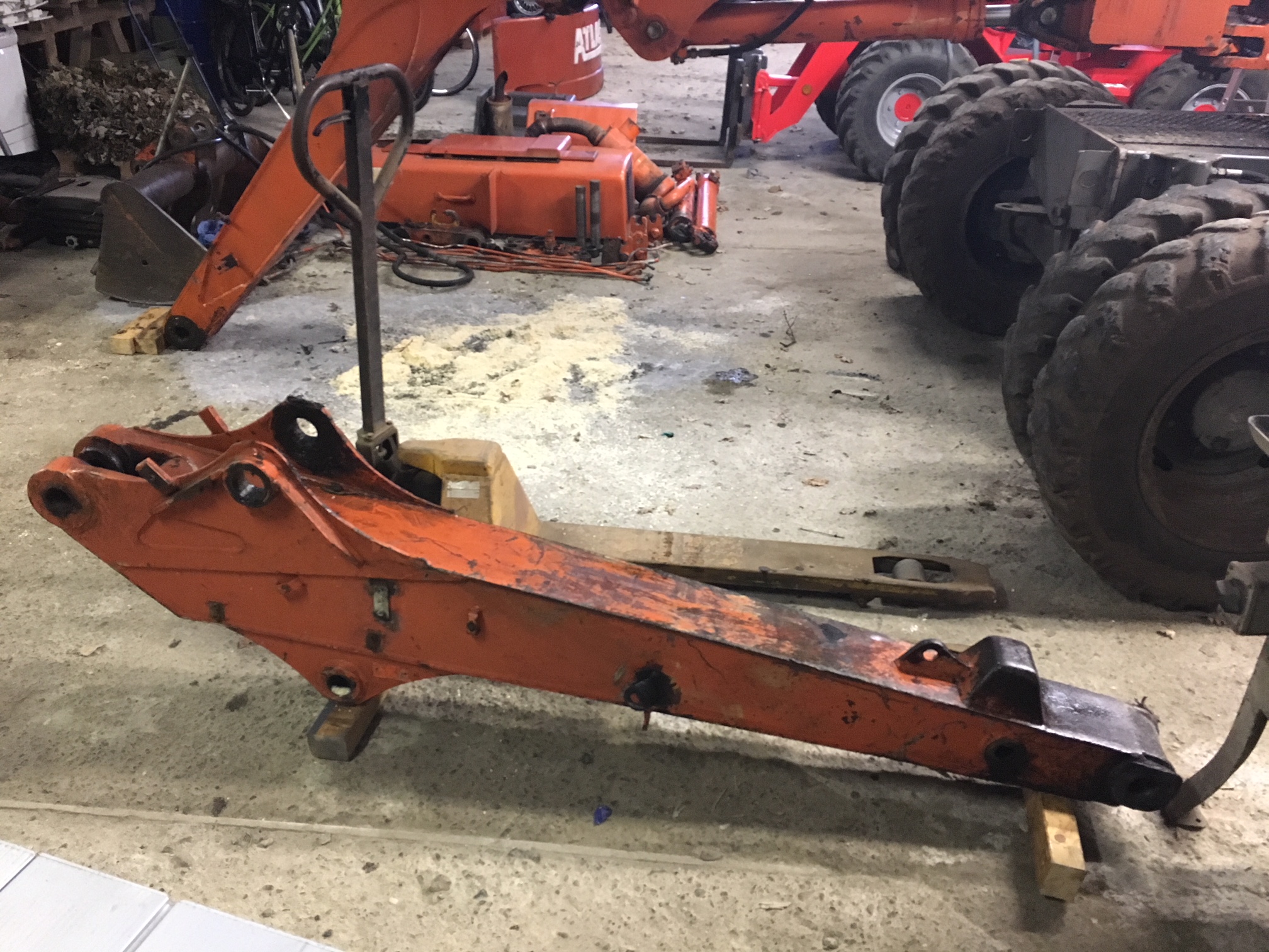 Dann habe ich es heute endlich geschafft den Bolzen aus dem Mittelarm zu drücken (Bolzen vom Verstellzylinder). Ich habe den Arm mit auf die Arbeit genommen und bin Ihm mit der 100-Tonnen-Presse zu Leibe gerückt... und siehe da... es machte "flutsch" und da war er raus! Über meine kleine 12t-Presse hat er nur müde gelächelt! :lol: Leider habe ich vergessen die Aktion zu fotografieren! :roll: