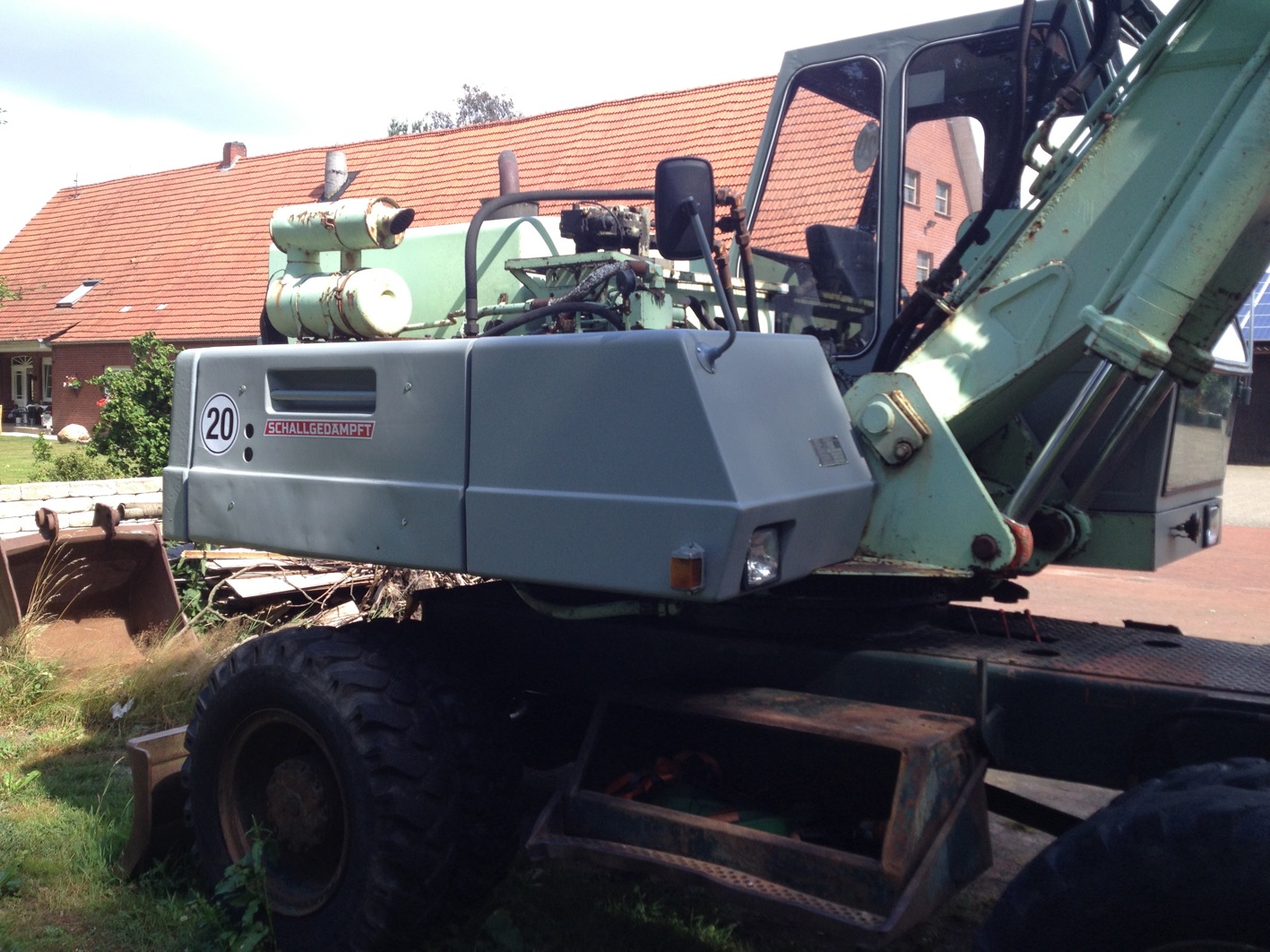 Er hat jetzt Musik in der Kabine (Aktivlautsprecher und Handyhalter), einen neuen hydraulischen Grabenräumlöffel... momentan noch ohne Aufnahmekopf (Teile werden grade gelasert),